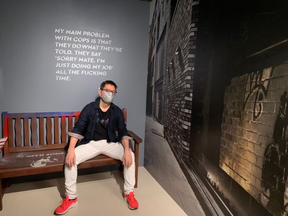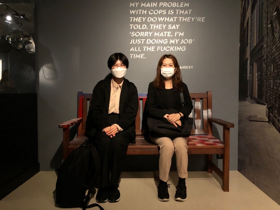 研修の合間には、バンクシーの作品と一緒に自分なりに表現をした写真撮影も楽しかったです。