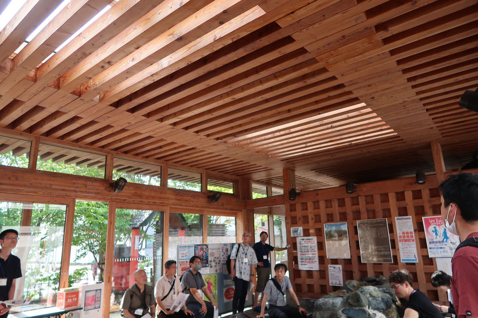 苫小牧信用金庫まちなか交流館は、面格子耐力壁が印象的な足湯施設です。集成材、面格子壁、筏屋根など、意匠を兼ねる構造部材となる製材と集成材を適材適所に配置され、開放的な空間でした。