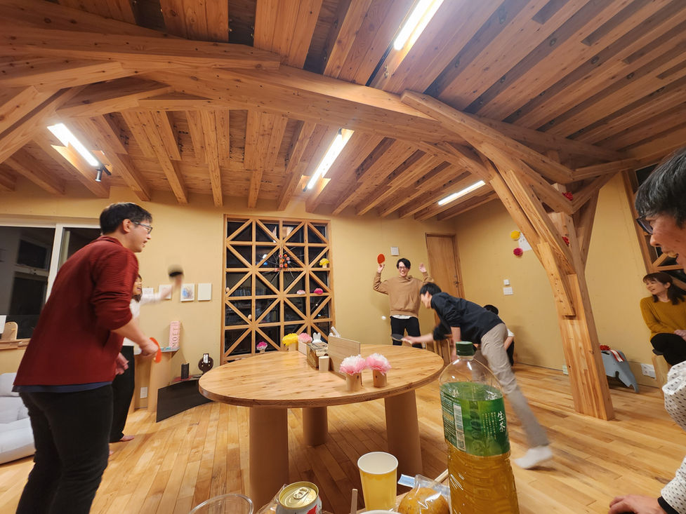 最後に山脇から心に刻まれる熱い応援メッセージを送って終わりのはずが、円卓卓球大会(!)が突然始まり1時間以上熱いプレイをしていい汗をかきました。