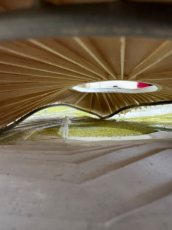 講評:木垂木の勾配がアーチ&カテナリーを生み、柱の疎密が空間のメリハリを感じさせる。動きのあるさとらんどにふさわしい架構です!