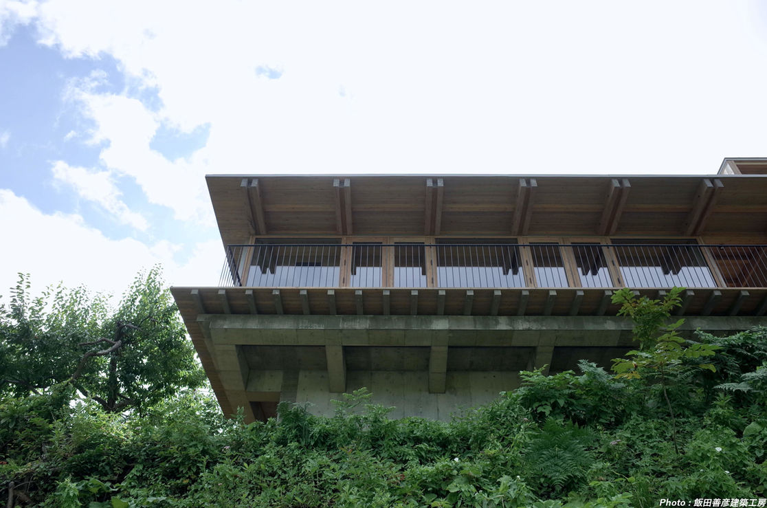 果物狩りと多様なアクティビティが売りの定山渓ファームに建つ休憩所。道産カラマツ集成材を用いた暖かみのあるシンプルな架構と、鋼製タイロッドによる開放感を意図した。崖地の有効利用と物見台としての機能から、斜面ギリギリまで木杭を打設し、RC基礎と木架構跳ね出しを垂木状に並べることで伸びやかな表現とした。
