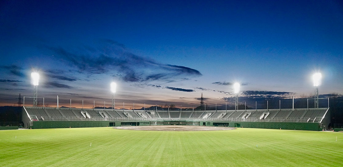 イサム・ノグチ氏がデザインしたモエレ沼公園の一角にある野球場の大規模な改修プロジェクト。埋立地でかつ地中埋設管を傷めないよう、杭は打設せずに直接基礎で設計した。スタンドはRC造2階建ての基礎深さを3m確保しつつ、壁厚・基礎梁幅を薄くすることで、地上部重量と排土重量をバランスさせる「浮き基礎」とした。への字型配置の1塁側・本塁側・3塁側スタンドは構造上縁を切りつつ、土中で防錆鉄筋により連結し不同沈下を極力生じさせない計画とした。施工中のプレロードの効果もあり、竣工時の不同沈下はほぼ生じていない。